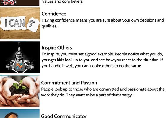 On this page, we will talk about the different types of Indigenous leaderships styles, skills, and attributes. Then, you can download some useful handouts to help you identify which leadership styles and skills you currently possess (this will change throughout your lives) and what skills you would like to further develop.