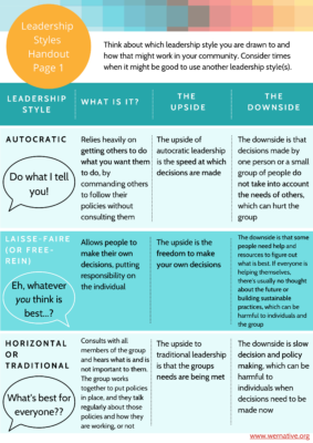 Think about which leadership style you are drawn to and how that might work in your community. Consider times when it might be good to use another leadership style(s).